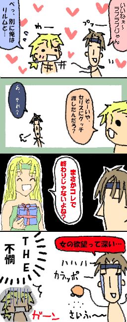 リルムにお返しをしたマッシュと、セリスにたかられるロック